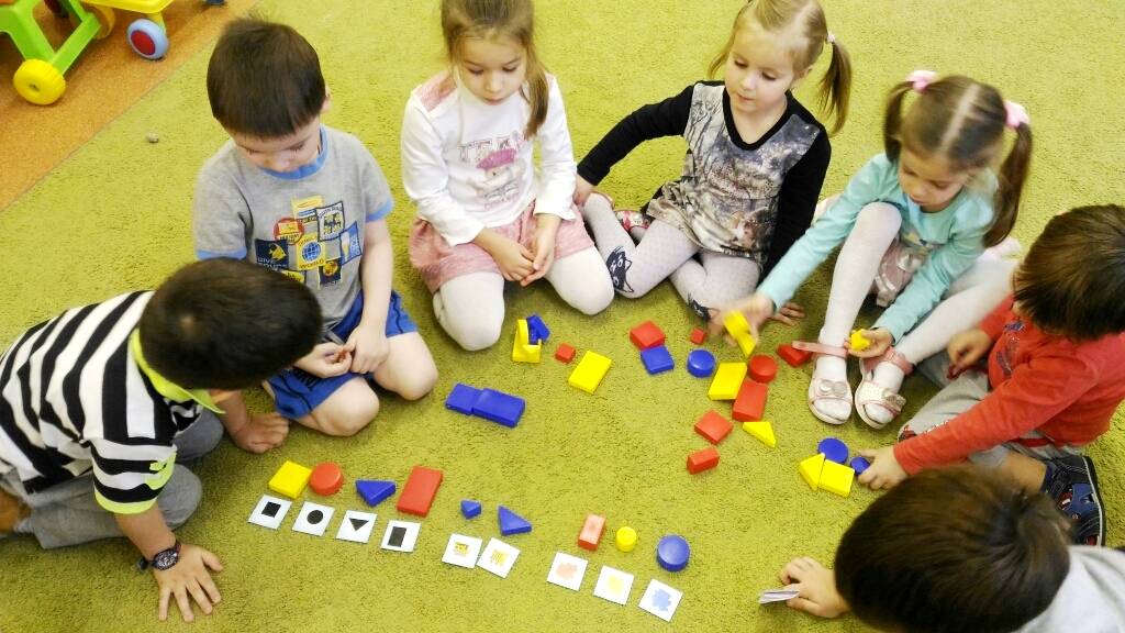 Дети 3-4 лет знакомятся с квадратом и кругом. Для этого взрослый дает каждому ребенку разные по цвету силуэты квадрата и круга. Показывая, например, квадрат синего цвета просит детей найти у себя такую же фигуру. То же самое он проделывает с кругом красного цвета, при этом название фигуры не произносит. Дальнейшее обследование геометрических фигур происходит осязательно-двигательным путем. Ребята многократно проводят пальцем по контуру фигуры и произносят ее название.