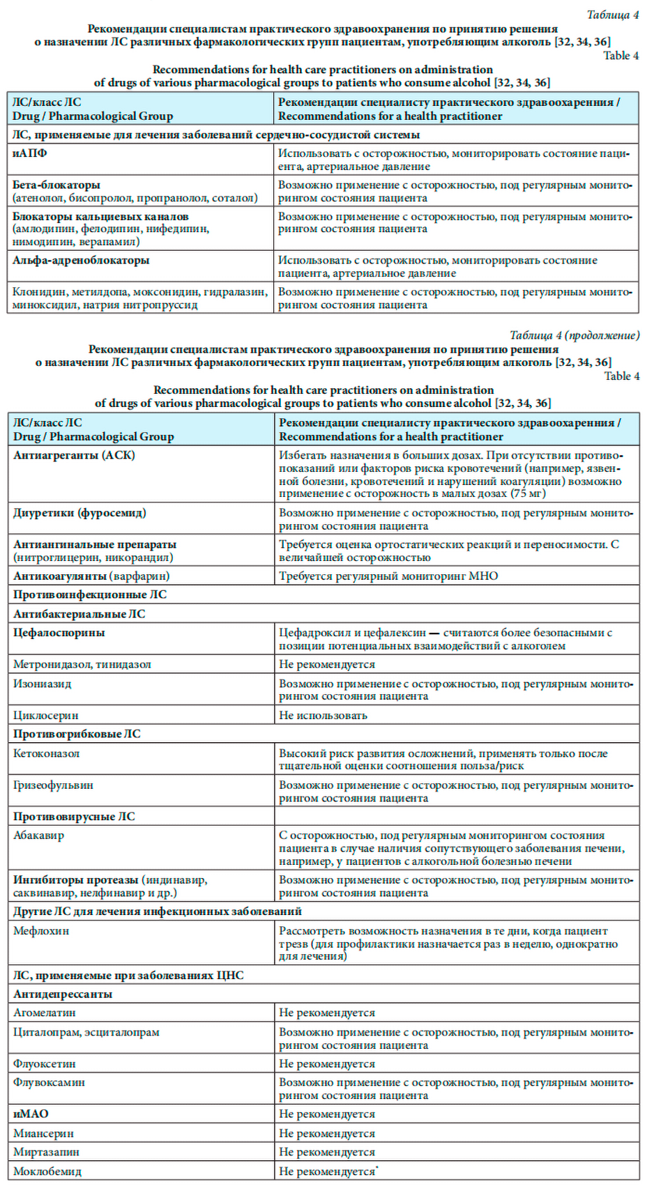 Сотрудники Национальной службы по охране здоровья Англии (National Health Service, NHS) разработали специальные рекомендации для врачей, чтобы упростить назначение различных препаратов пациентам, употребляющих алкоголь . Эта информация, представленная в таблице 4, может помочь и первостольнику в консультировании клиента аптеки, задающего вопросы о допустимости употребления спиртного во время курса лечения.