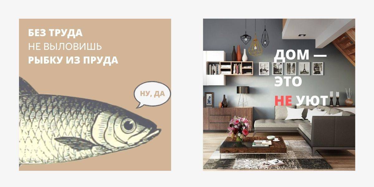 В первом варианте визуал вводит дополнительного персонажа – рыбу, которая в шутку подтверждает поговорку. Во втором он противопоставлен смыслу – красивая картинка интерьера сталкивается с обратной по смыслу надписью.