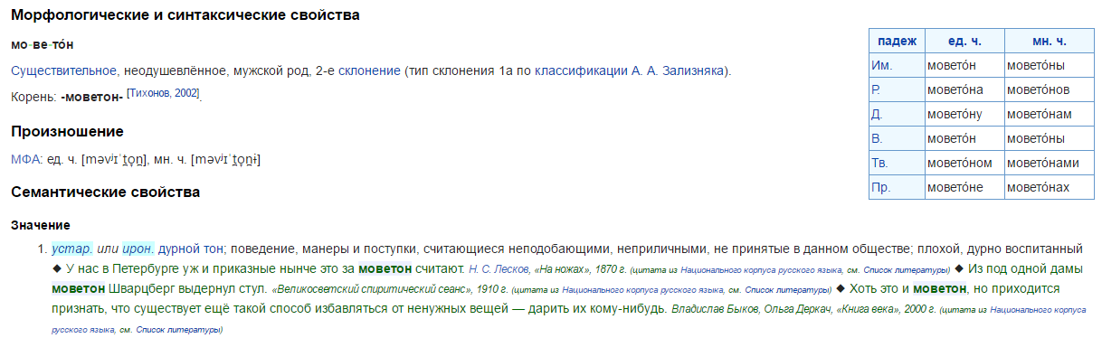 На родном языке моветон пишется как моветон. Это означает безвкусицу, безвкусицу, дурной поступок. Мы видим, что это не слово, а целое выражение, которое впоследствии приобрело иную лексическую форму.