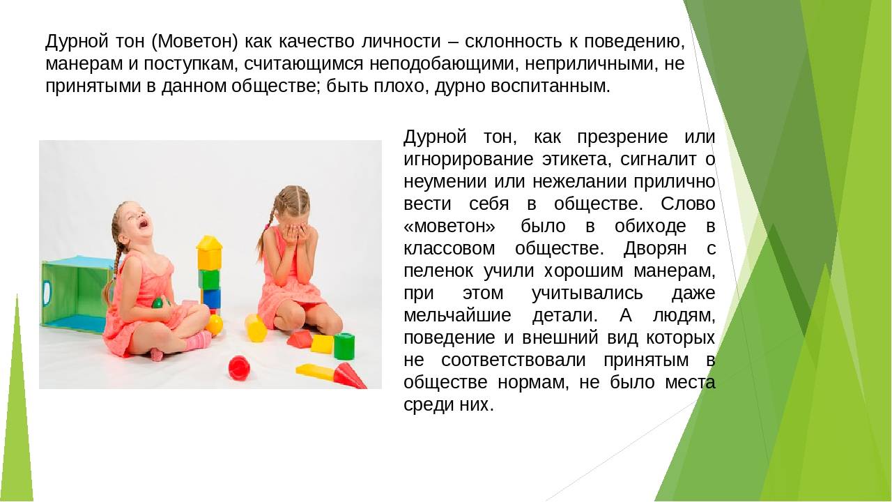 Моветоном также может считаться неправильная реакция на эмоции ребенка. Например, подавлять или игнорировать их чувства, высмеивать или принижать их эмоциональное состояние. Дети должны чувствовать, что их чувства важны и уважаемы.