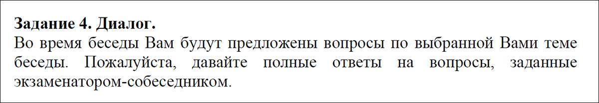 Четвёртое задание начнётся сразу после того, как вы завершите монолог, поэтому на подготовку времени не будет. Во время диалога экзаменатор-собеседник будет задавать вопросы по той теме, которую вы выбрали в третьем задании.