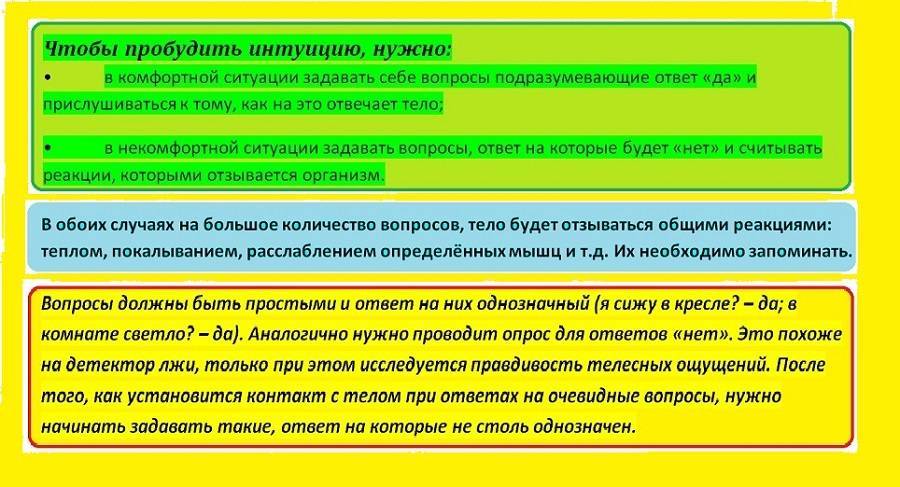 Важно! Признаком развитой интуиции считаются телесные ответы на вопросы, которые можно считывать, накопив опыт. Пробудить интуицию можно, выполняя упражнения, указанные на картинке ниже