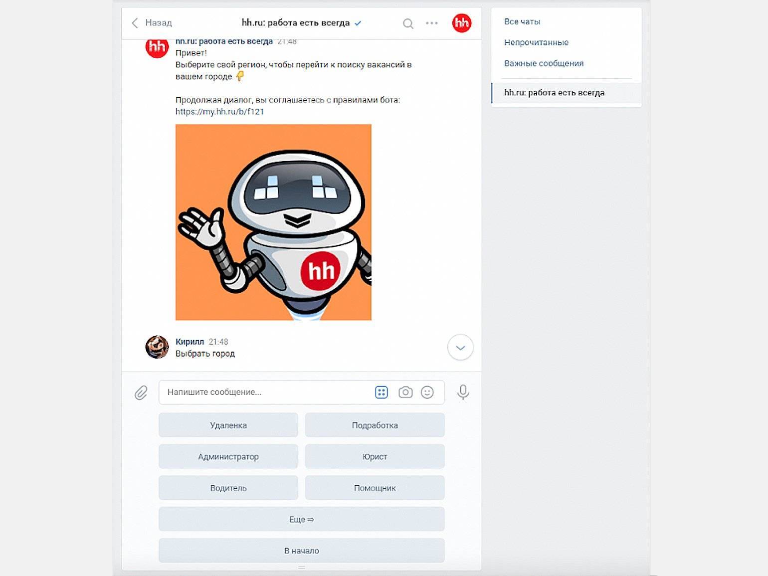 Чат-бот во «ВКонтакте» от компании HeadHunter. Скриншот: официальная страница HeadHunter во «ВКонтакте»