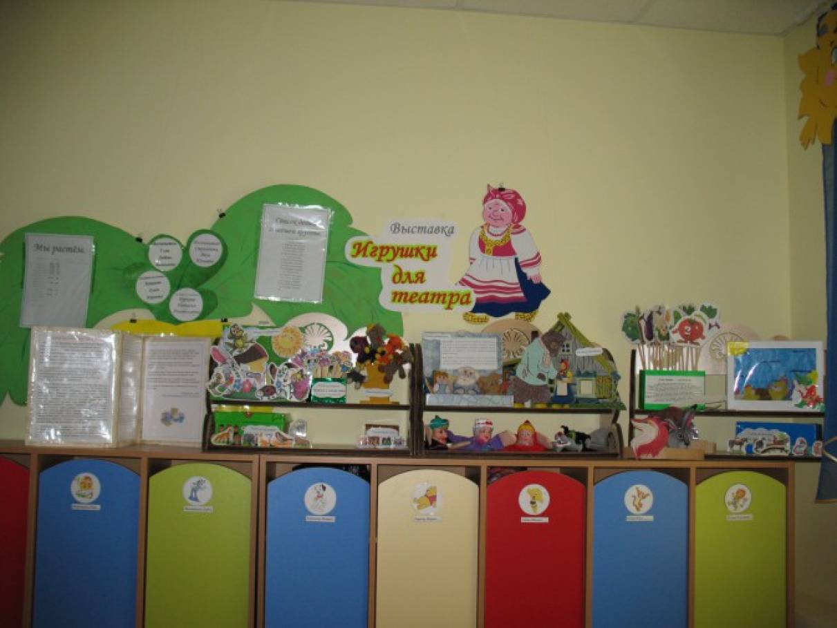 Папка-передвижка « Театр и дети», выставка методической литературы,» Маршрут выходного дня»-репертуар детских театров на март и апрель, выставка детских рисунков и поделок на тему: «Театр глазами детей».