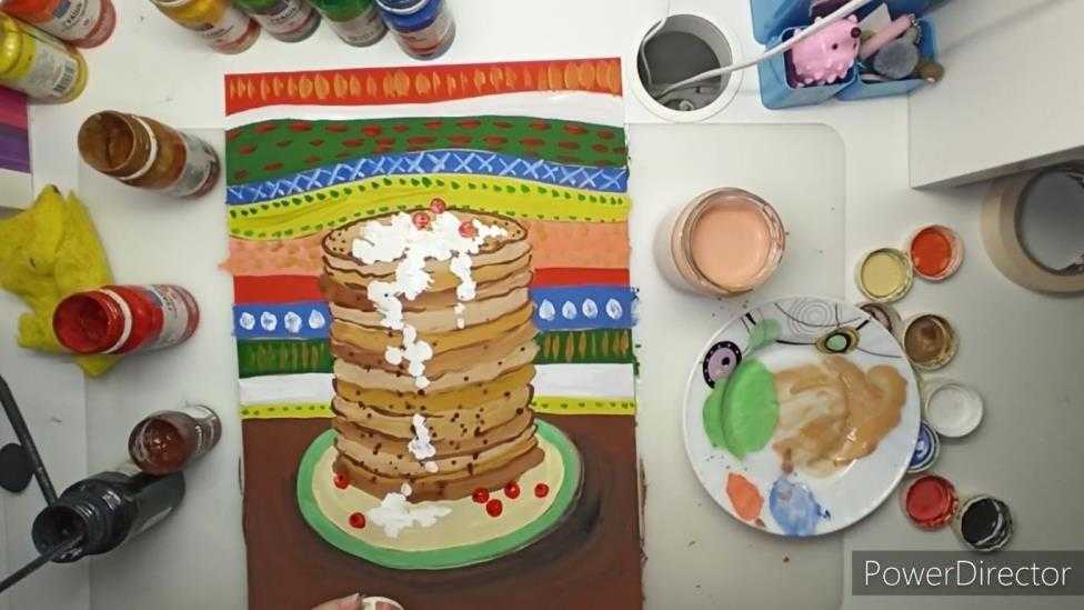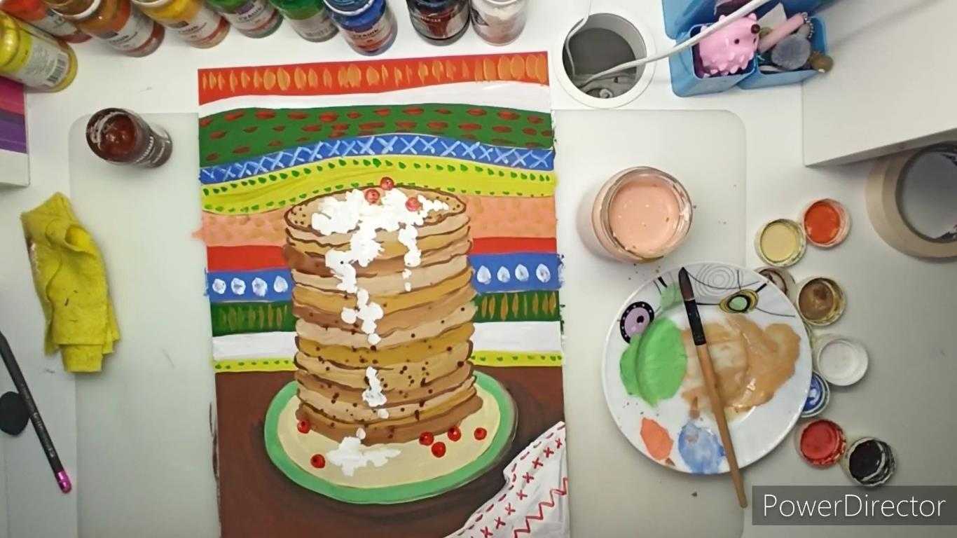 Начинаем оформлять стол коричневой краской, рядом с тарелкой добавляем более темный тон, вырисовывая тень. Блины раскрашиваем разными оттенками бежевого: где-то добавляем больше охры, где-то коричневого или белого. Незабываем обозначать контур темным цветом. Рекомендуем дополнить композицию брызгами.
