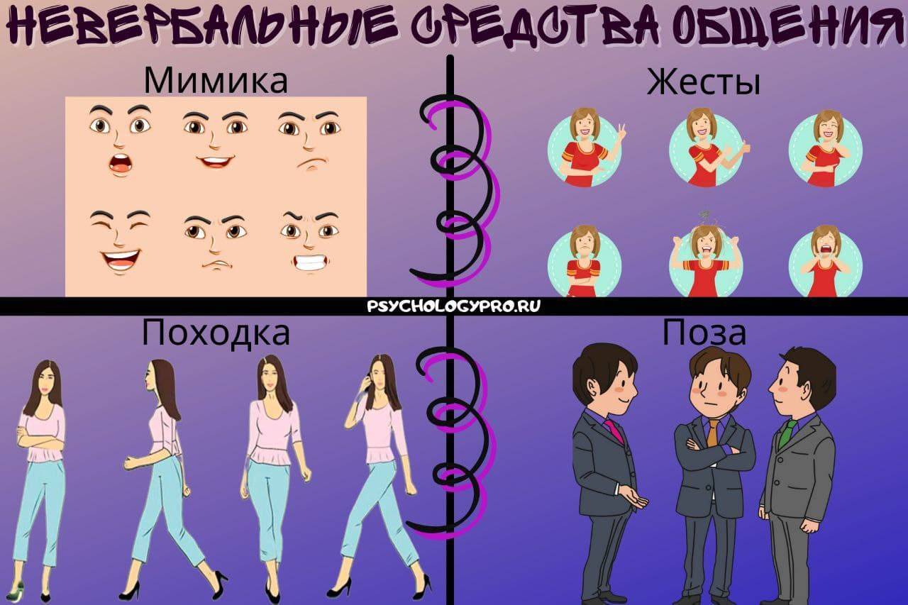 Чтобы научиться лучше понимать собеседника и распознавать его скрытые сигналы, для начала следует научиться обращать внимание одновременно на все элементы или средства невербального общения, а к невербальным средствам общения относятся мимика, жесты, позы, интонация и тембр голоса, визуальный контакт и межличностное пространство. Поговорим подробней о каждом из этих элементов невербального общения и приведем конкретные примеры их проявления