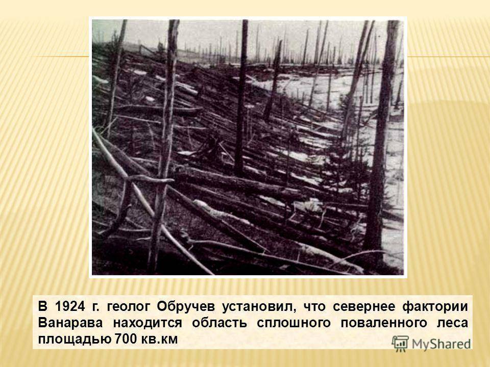 В 1924 г. геолог Обручев установил, что севернее фактории Ванарава находится область сплошного поваленного леса площадью 700 кв.км