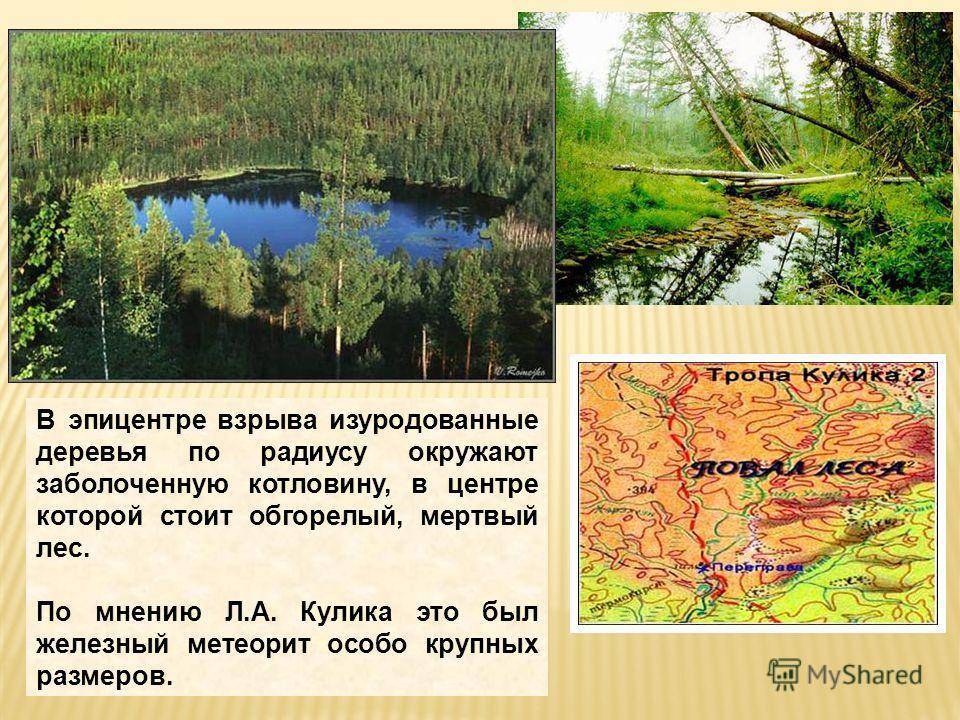 В эпицентре взрыва изуродованные деревья по радиусу окружают заболоченную котловину, в центре которой стоит обгорелый, мертвый лес. По мнению Л.А. Кулика это был железный метеорит особо крупных размеров.