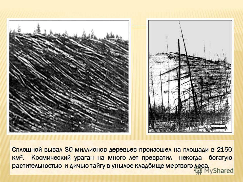 Сплошной вывал 80 миллионов деревьев произошел на площади в 2150 км². Космический ураган на много лет превратил некогда богатую растительностью и дичью тайгу в унылое кладбище мертвого леса.