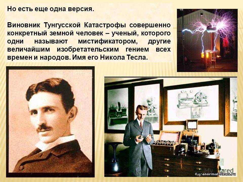 Не менее интересна версия об участии в произошедших событиях Николы Теслы. Этот великий ученый-физик активно изучал возможности электричества, пытаясь найти возможность обуздать эту энергию на пользу человечества. Тесла утверждал, что поднявшись на несколько километров вверх, можно передавать электрическую энергию на большие расстояния, используя земную атмосферу и силу молний.