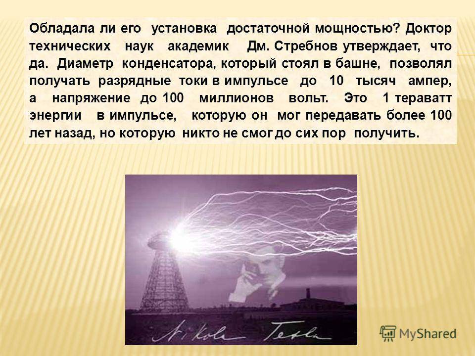 Обладала ли его установка достаточной мощностью? Доктор технических наук академик Дм. Стребнов утверждает, что да. Диаметр конденсатора, который стоял в башне, позволял получать разрядные токи в импульсе до 10 тысяч ампер, а напряжение до 100 миллионов вольт. Это 1 тераватт энергии в импульсе, которую он мог передавать более 100 лет назад, но которую никто не смог до сих пор получить.