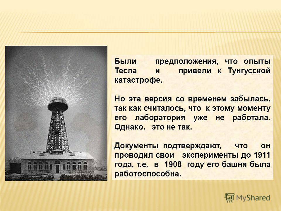 Были предположения, что опыты Тесла и привели к Тунгусской катастрофе. Но эта версия со временем забылась, так как считалось, что к этому моменту его лаборатория уже не работала. Однако, это не так. Документы подтверждают, что он проводил свои эксперименты до 1911 года, т.е. в 1908 году его башня была работоспособна.