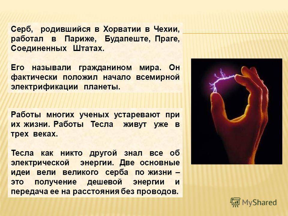 Серб, родившийся в Хорватии в Чехии, работал в Париже, Будапеште, Праге, Соединенных Штатах. Его называли гражданином мира. Он фактически положил начало всемирной электрификации планеты. Работы многих ученых устаревают при их жизни. Работы Тесла живут уже в трех веках. Тесла как никто другой знал все об электрической энергии. Две основные идеи вели великого серба по жизни – это получение дешевой энергии и передача ее на расстояния без проводов.