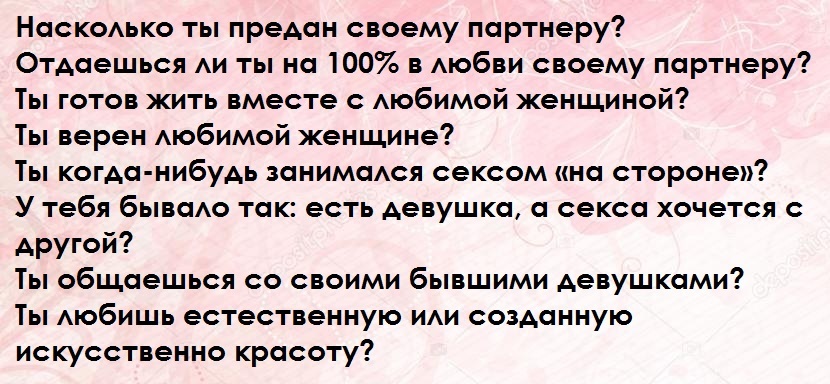 Основное правило в каверзных вопросах: их нужно задавать человеку с которым встречаешься или на пути к этому. Так как данные вопросы, могут восприняться не совсем правильно, перед изложением вопроса, подумайте, какова может быть реакция у мужчины, чтобы не испортить отношения.