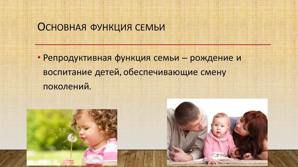 Репродуктивная | Одна из главных функций семьи. К ней относится не только воспитание детей, но и удовлетворение потребности в близости. |