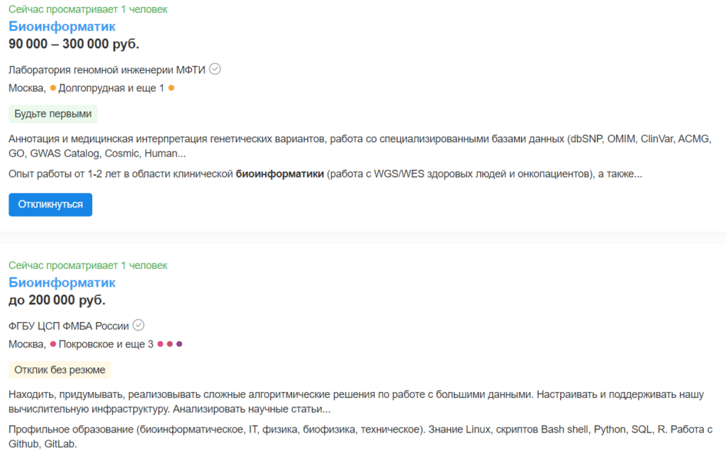 Востребованность. На хедхантере есть всего девять вакансий с упоминанием биоинженерии. Но и претендентов немного.