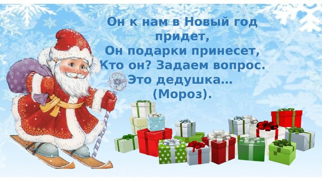 Мужик, что с красным носом От водки иль мороза, Приходит каждый Новый год, Подарки детям раздает. (Дед Мороз.)
