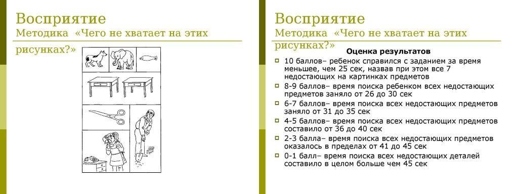 Используются классические и авторские бланковые методики (обычно около 25), каждый ребенок обследуется индивидуально, его данные заносятся в опросный бланк.