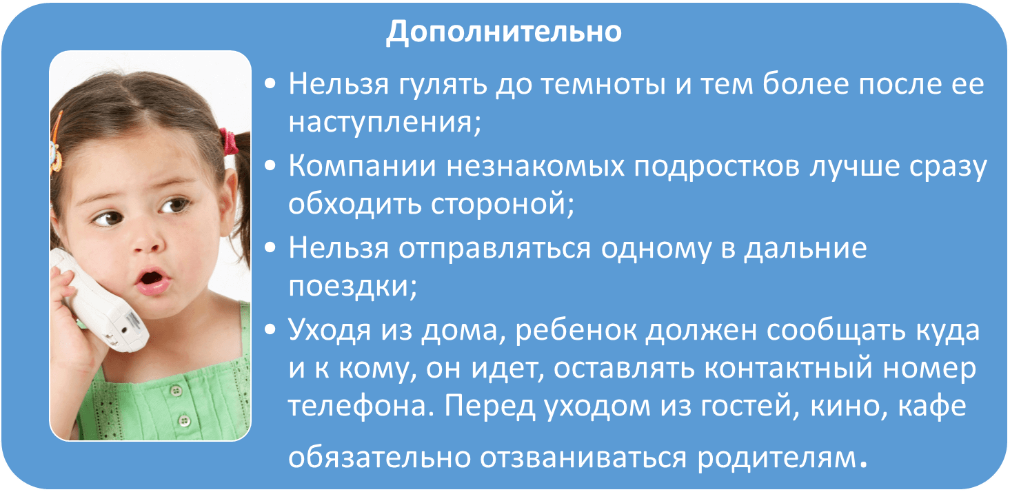 - Уходя из дома, ребенок должен сообщать куда и к кому, он идет, оставлять контактный номер телефона. Перед уходом из гостей, кино, кафе обязательно отзваниваться родителям.