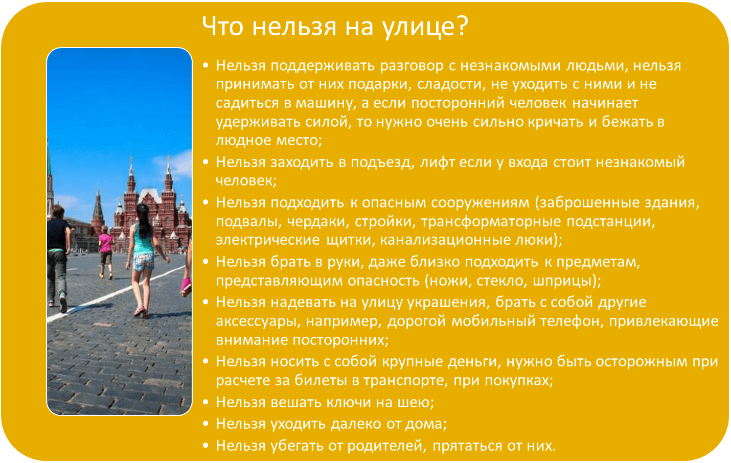 - Правила поведения на улице запрещают разговаривать без присутствия взрослого с малознакомыми людьми.