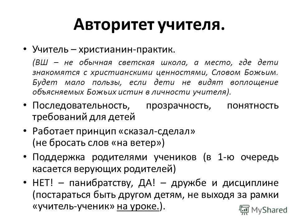 Авторитет учителя. Учитель – христианин-практик. (ВШ – не обычная светская школа, а место, где дети знакомятся с христианскими ценностями, Словом Божьим. Будет мало пользы, если дети не видят воплощение объясняемых Божьих истин в личности учителя). Последовательность, прозрачность, понятность требований для детей Работает принцип «сказал-сделал» (не бросать слов «на ветер») Поддержка родителями учеников (в 1-ю очередь касается верующих родителей) НЕТ! – панибратству, ДА! – дружбе и дисциплине (постараться быть другом детям, не выходя за рамки «учитель-ученик» на уроке.).