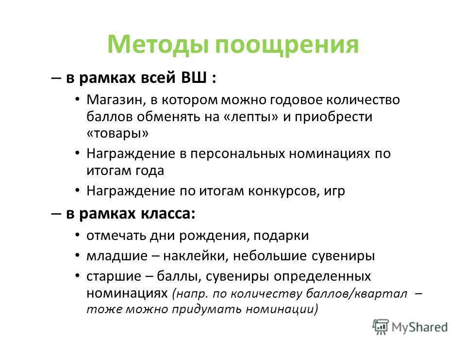 Методы поощрения – в рамках всей ВШ : Магазин, в котором можно годовое количество баллов обменять на «лепты» и приобрести «товары» Награждение в персональных номинациях по итогам года Награждение по итогам конкурсов, игр – в рамках класса: отмечать дни рождения, подарки младшие – наклейки, небольшие сувениры старшие – баллы, сувениры определенных номинациях (напр. по количеству баллов/квартал – тоже можно придумать номинации)