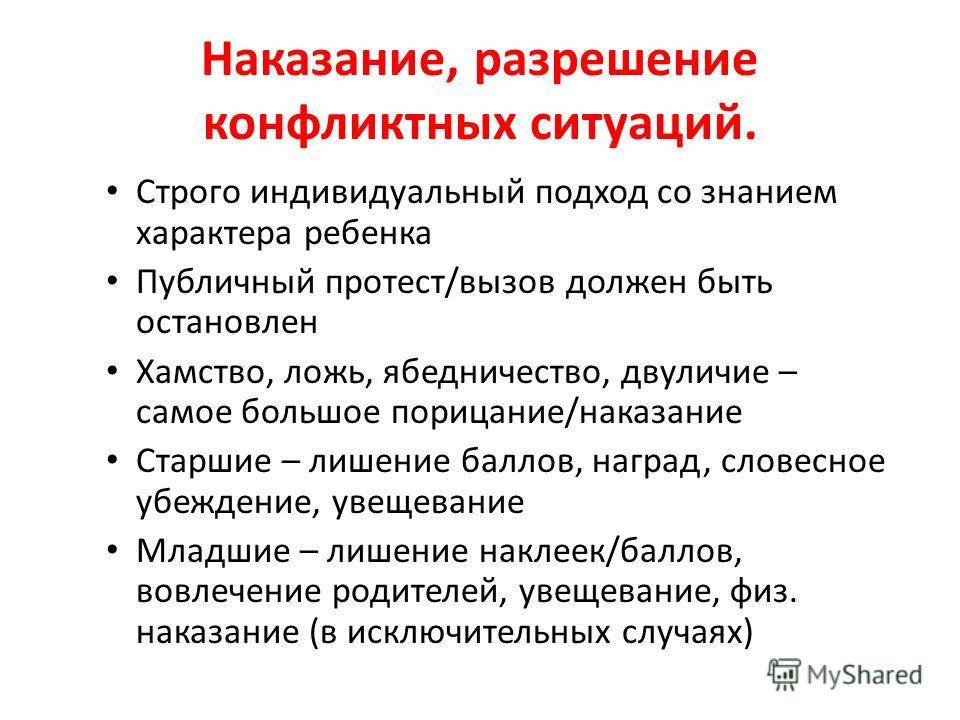 Наказание, разрешение конфликтных ситуаций. Строго индивидуальный подход со знанием характера ребенка Публичный протест/вызов должен быть остановлен Хамство, ложь, ябедничество, двуличие – самое большое порицание/наказание Старшие – лишение баллов, наград, словесное убеждение, увещевание Младшие – лишение наклеек/баллов, вовлечение родителей, увещевание, физ. наказание (в исключительных случаях)