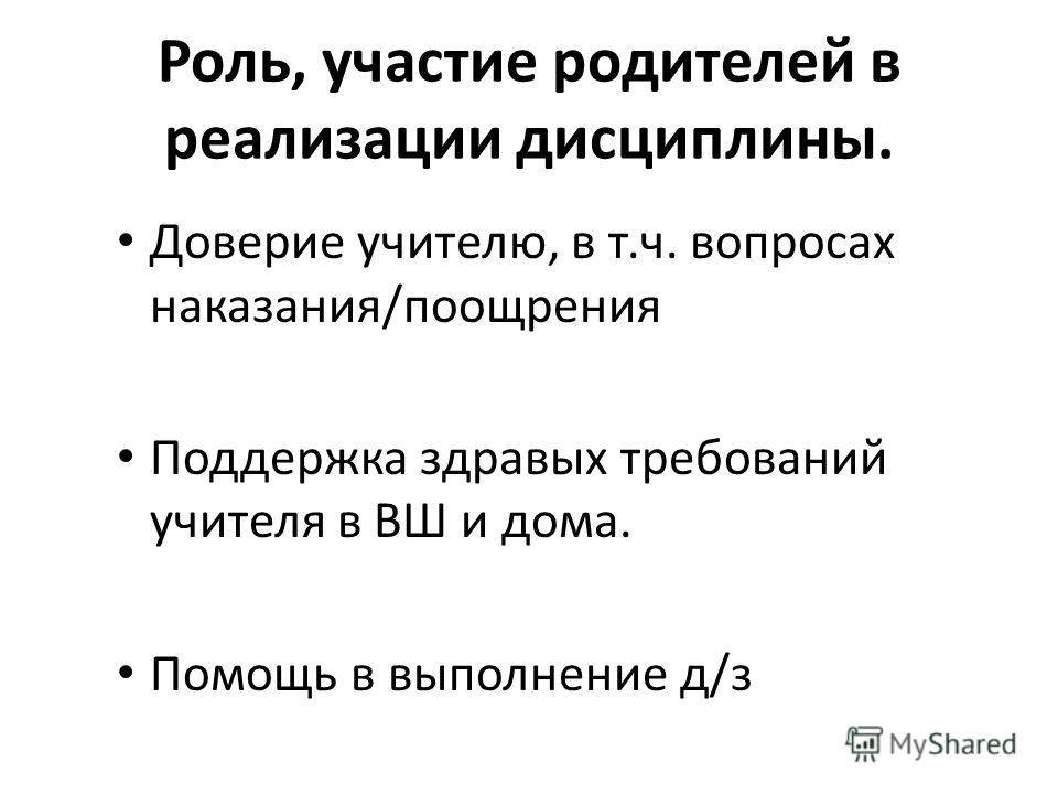Роль, участие родителей в реализации дисциплины. Доверие учителю, в т.ч. вопросах наказания/поощрения Поддержка здравых требований учителя в ВШ и дома. Помощь в выполнение д/з