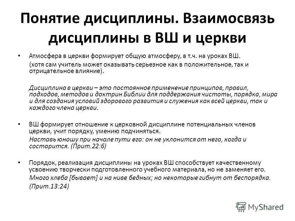 Понятие дисциплины. Взаимосвязь дисциплины в ВШ и церкви Атмосфера в церкви формирует общую атмосферу, в т.ч. на уроках ВШ. (хотя сам учитель может оказывать серьезное как в положительное, так и отрицательное влияние). Дисциплина в церкви – это постоянное применение принципов, правил, подходов, методов и доктрин Библии для поддержания чистоты, порядка, мира и для создания условий здорового развития и служения как всей церкви, так и каждого члена церкви. ВШ формирует отношение к церковной дисциплине потенциальных членов церкви, учит порядку, умению подчиняться. Наставь юношу при начале пути его: он не уклонится от него, когда и состарится. (Прит.22:6) Порядок, реализация дисциплины на уроках ВШ способствует качественному усвоению творчески подготовленного учебного материала, но не заменяет его. Много хлеба и на ниве бедных; но некоторые гибнут от беспорядка. (Прит.13:24)