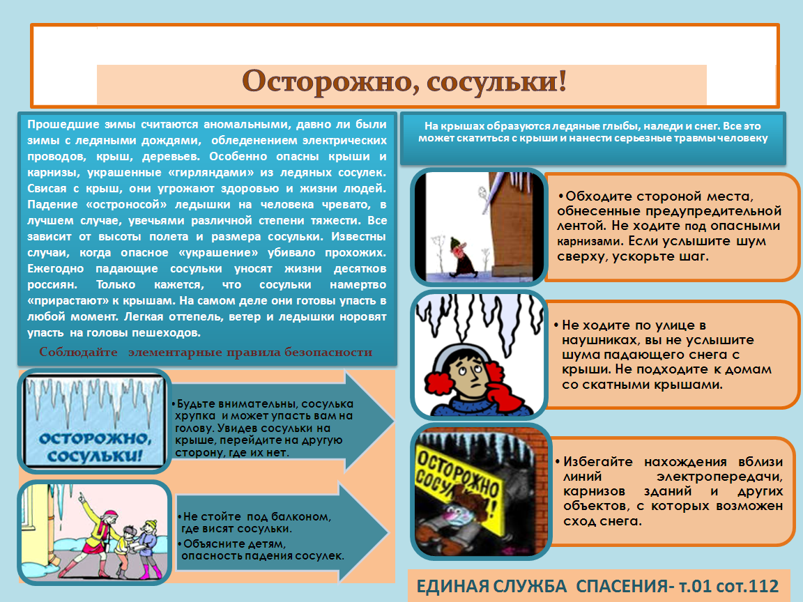 Каждый раз перед прогулкой напоминайте ребёнку об опасности игр под крышами многоэтажных домов, где велика вероятность падения сосулек. Небольшим детям, которым очень хочется попробовать всё на вкус, расскажите всю правду о сосульках: что облизывая сосульку, малыш не только рискует заболеть, но и глотает химические отходы и птичий помет.