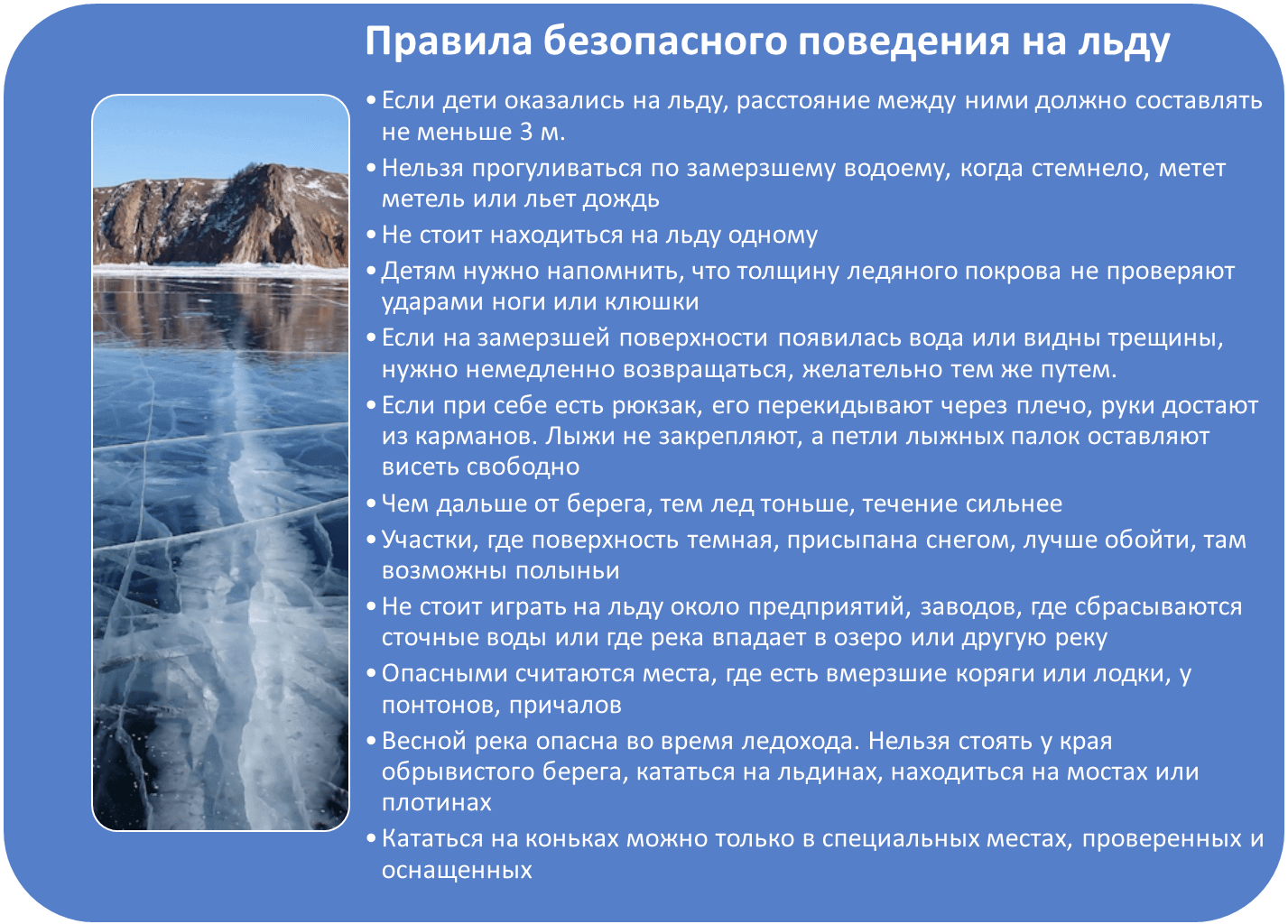 Наступил зимний период, все водные объекты покрылись тонким льдом. Лёд становится прочным только после того, как установятся морозные непрерывные дни. Опасны кратковременные оттепели, так как это приводит к потере прочности. Все знакомы с основными правилами безопасного поведения на водоемах, но не все их соблюдают. Это те люди, которые, не дожидаясь необходимой прочности льда, забывая про запрещающие знаки и указатели, выходят на ледовые поля, что бы лихо пробежать на коньках, опробовать хоккейные клюшки, посидеть с удочкой над лункой, а то и сократить путь и бесстрашно перейти водоём напрямик, не думая о последствиях.