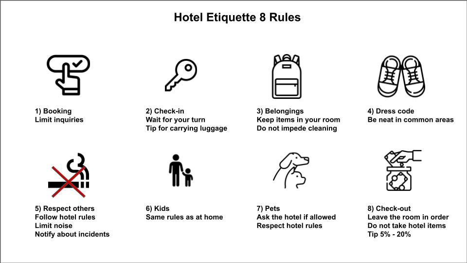 Гостиничный этикет – это свод правил пребывания в отеле. Он включает в себя правильный способ бронирования, регистрации заезда и отъезда и соответствующее поведение.