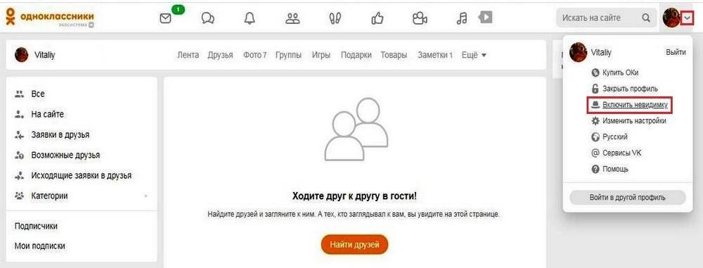 Чтобы стать невидимкой в Одноклассниках, необходимо сначала войти на сайт. Потом справа от миниатюрного изображения своего профиля нажимаем на стрелочку. Далее в выпадающем списке выбираем пункт «Включить невидимку».