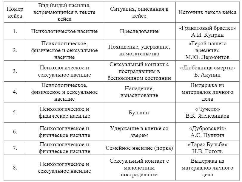 В таблице 1 представлены сформированные кейсы с описанием вида(-ов) и ситуаций насилия, описанных в них.