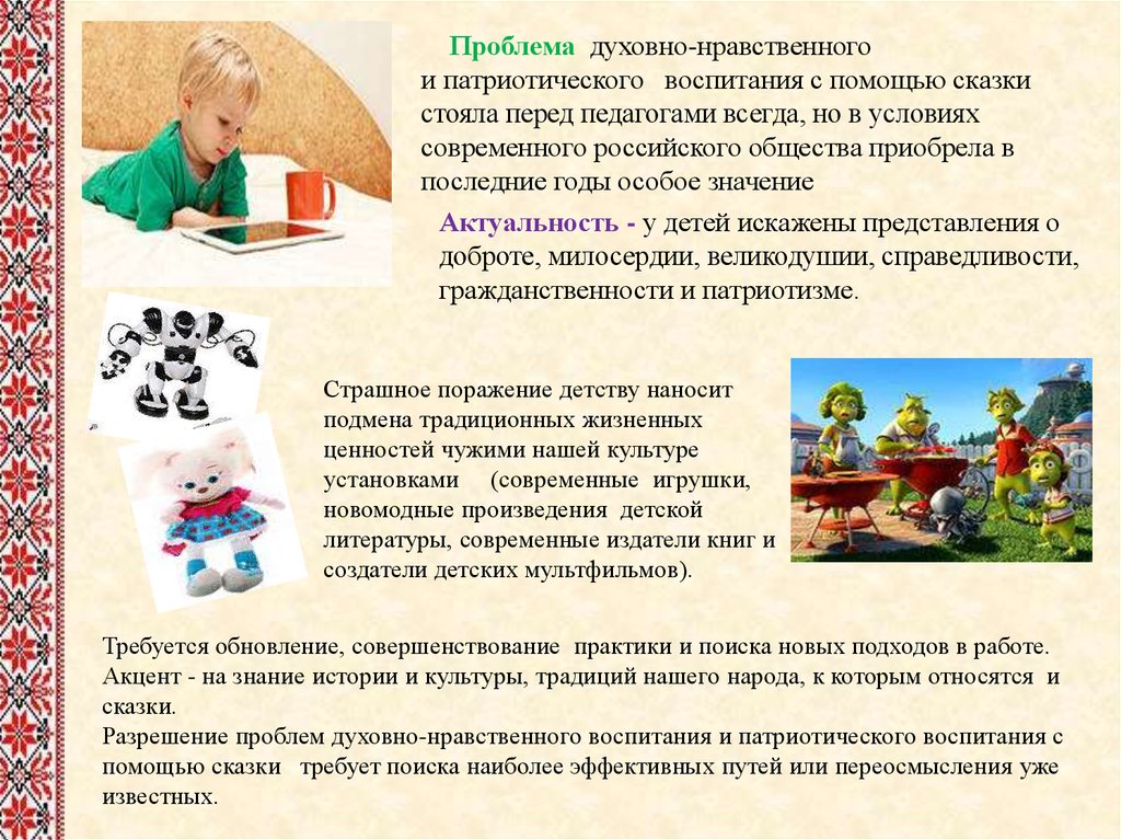 Воспитание детей осуществлялось не путем назиданий, будущие патриоты шли по стопам своих родителей, видя перед глазами живой пример, посильно участвуя во всех делах семьи и общества. Тренировочные ситуации не создавались искусственно, сама жизнь заставляла находить правильные пути и решения, это был вопрос сохранения семьи, государства. Церковь еще не была «опиумом для народа» а являлась центром духовности и нравственности.