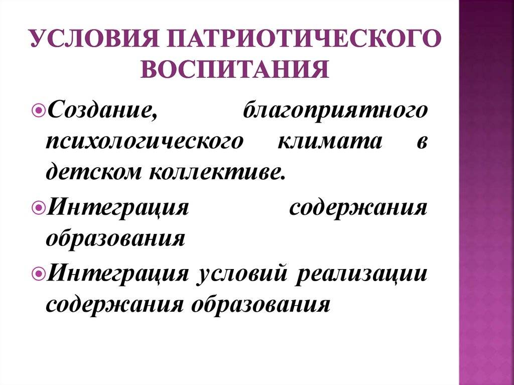 Формирование патриотических чувств осуществляется в процессе вовлечения молодежи в активную творческую работу на благо Отечества, воспитания уважительного отношения к истории Отечества, его культурному наследию, обычаям и традициям народа, любви к свою малую родину, для своих родных мест; воспитание готовности защищать Родину; изучение культуры и традиций разных народов. Воспитание патриота – одна из важнейших задач современных образовательных учреждений.