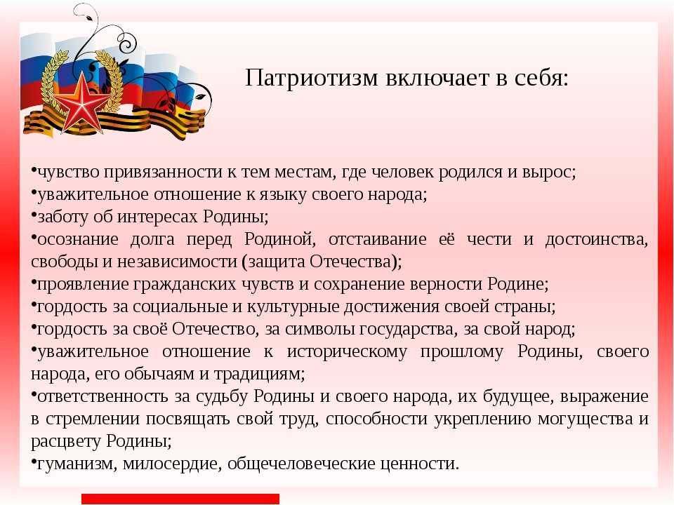 Следует сказать, что чем выше уровень развития чувства патриотизма, тем неразрывно он связан с активной общественной деятельностью, действиями и поступками, совершаемыми на благо Родины и на основе демократических принципов развития гражданского общества. общество.