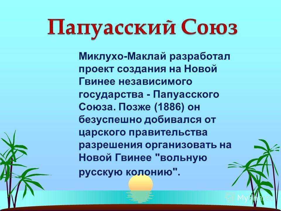 Миклухо-Маклай разработал проект создания на Новой Гвинее независимого государства – Папуасского Союза. Позже (1886) он безуспешно добивался от царского правительства разрешения организовать на Новой Гвинее “вольную русскую колонию”.