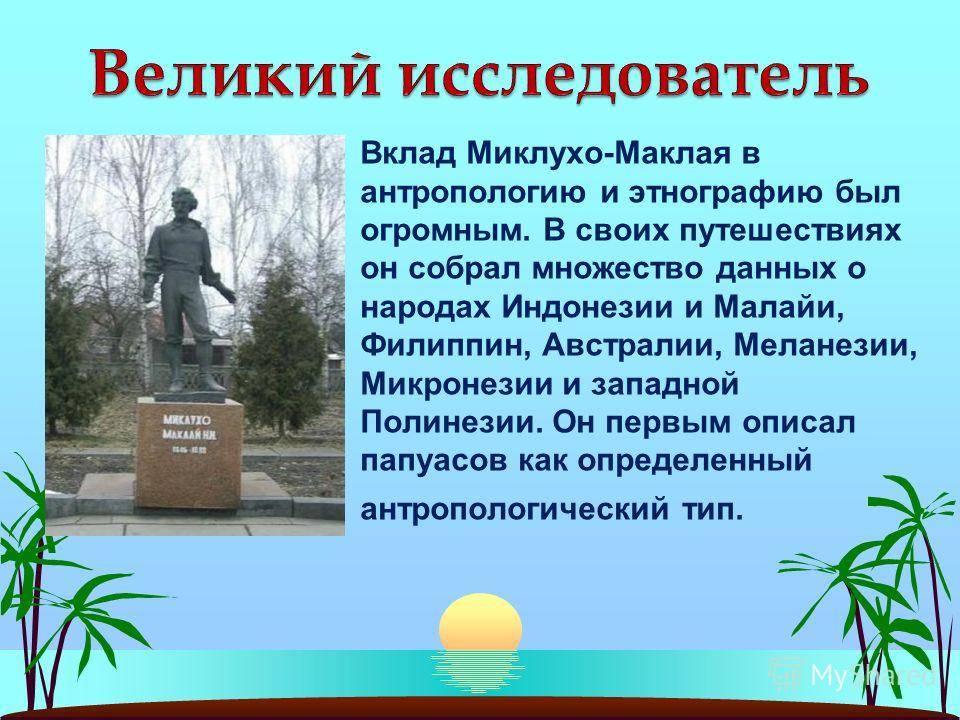Вклад Миклухо-Маклая в антропологию и этнографию был огромным. В своих путешествиях он собрал множество данных о народах Индонезии и Малайи, Филиппин, Австралии, Меланезии, Микронезии и западной Полинезии. Он первым описал папуасов как определенный антропологический тип.