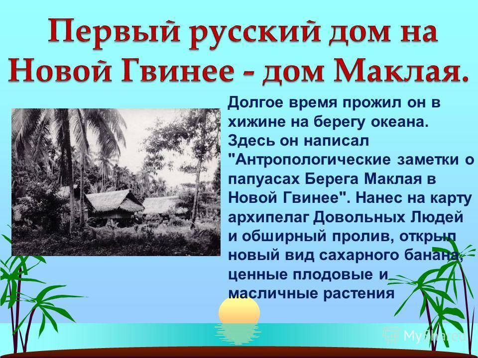 Долгое время прожил он в хижине на берегу океана. Здесь он написал “Антропологические заметки о папуасах Берега Маклая в Новой Гвинее”. Нанес на карту архипелаг Довольных Людей и обширный пролив, открыл новый вид сахарного банана, ценные плодовые и масличные растения