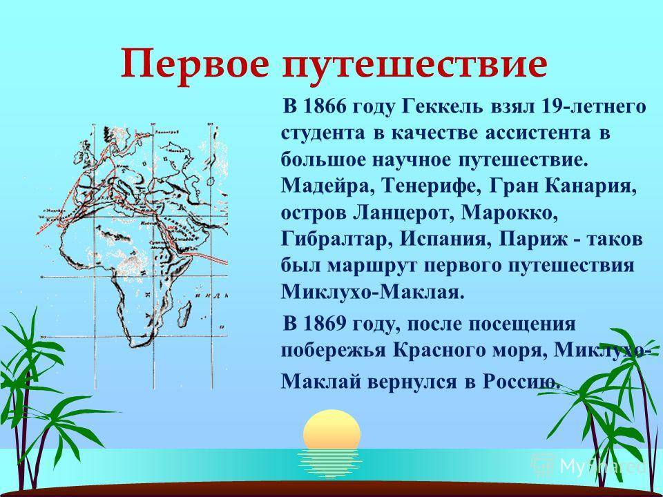 Первое путешествие В 1866 году Геккель взял 19-летнего студента в качестве ассистента в большое научное путешествие. Мадейра, Тенерифе, Гран Канария, остров Ланцерот, Марокко, Гибралтар, Испания, Париж – таков был маршрут первого путешествия Миклухо-Маклая. В 1869 году, после посещения побережья Красного моря, Миклухо- Маклай вернулся в Россию.