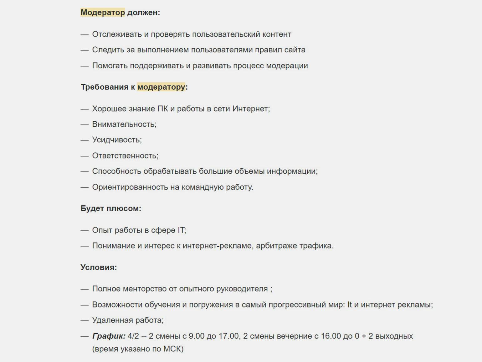 Как устроена работа? Работа модератора привязана к графику: он должен находиться в сети и следить за порядком как минимум несколько часов в день. Обычно график дежурства оговаривается с работодателем: это может быть и три часа в сутки, и день через два.