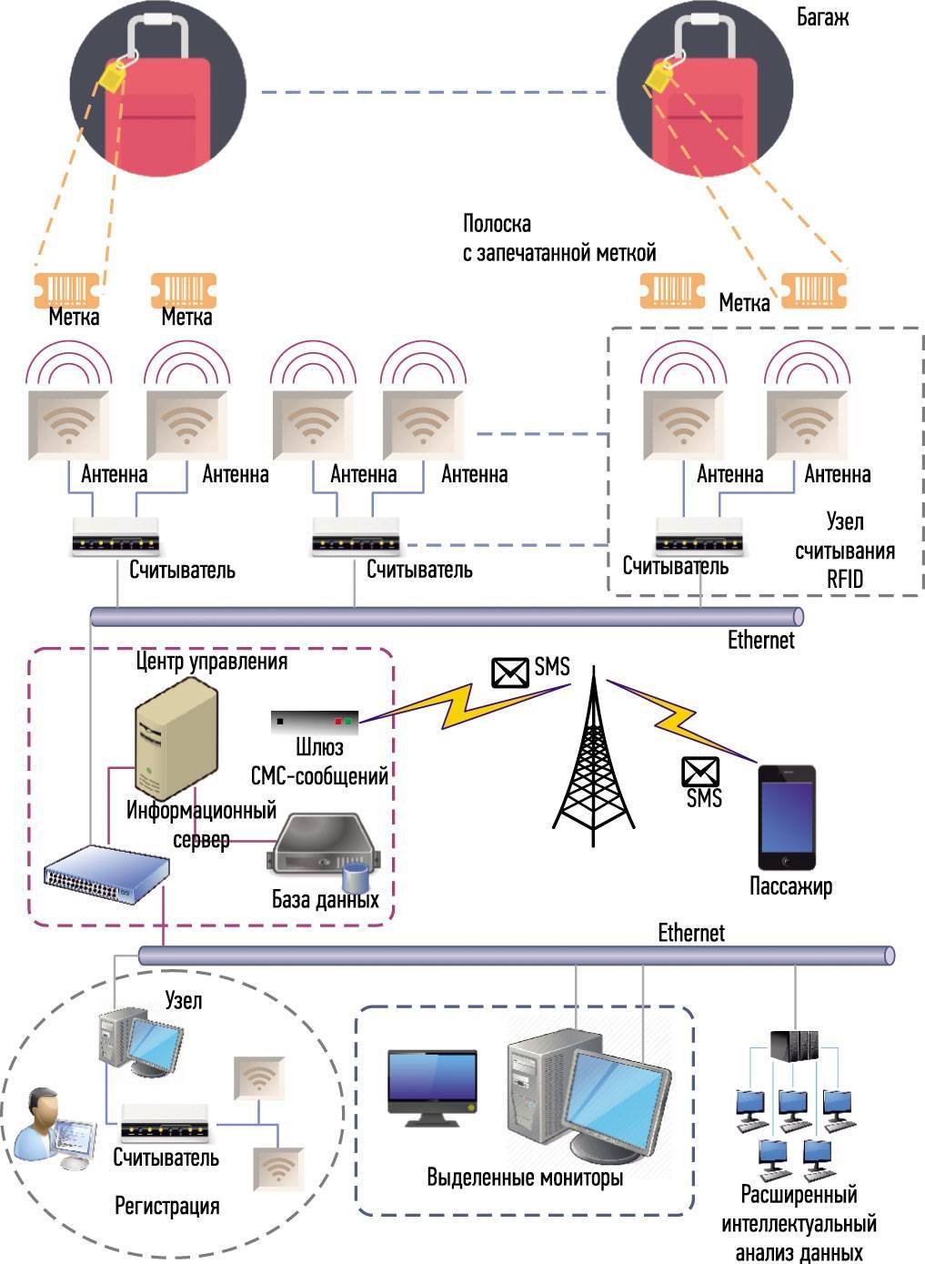 Некоторые системы предполагают использование SMS-уведомлений вместо приложений . Пример архитектуры системы обработки багажа в аэропорту Пекина, использующей SMS-уведомления, представлен на рис. 4.