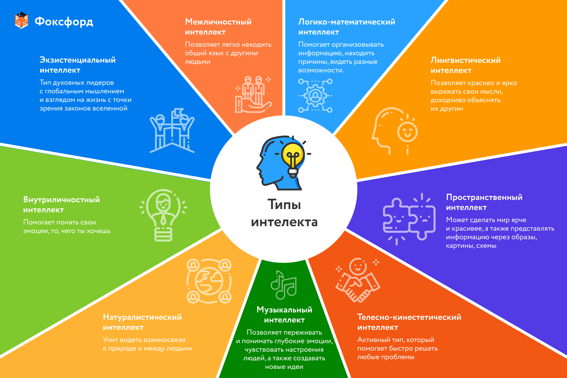 Интеллектуальное развитие включает в себя несколько направлений, каждое из которых играет значительную роль. Выделяют следующие виды интеллекта: