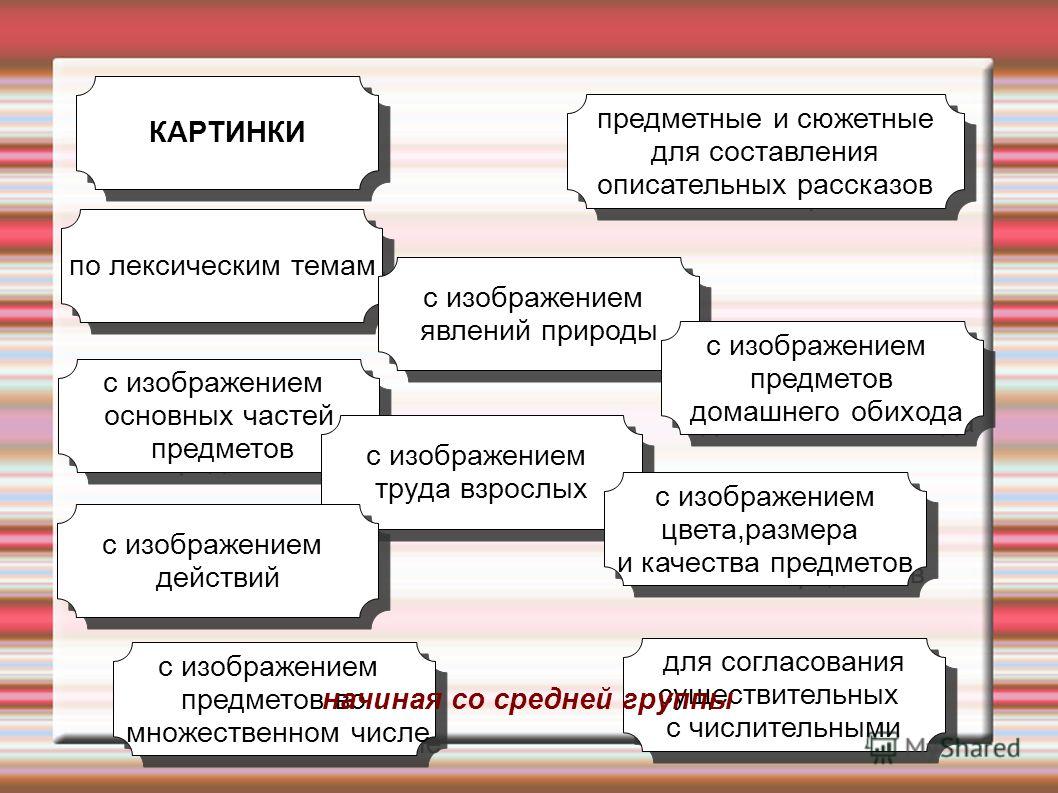КАРТИНКИ по лексическим темам с изображением явлений природы с изображением явлений природы с изображением предметов домашнего обихода с изображением предметов домашнего обихода с изображением основных частей предметов с изображением основных частей предметов с изображением труда взрослых с изображением труда взрослых с изображением цвета,размера и качества предметов с изображением цвета,размера и качества предметов с изображением действий с изображением действий с изображением предметов во множественном числе с изображением предметов во множественном числе для согласования существительных с числительными для согласования существительных с числительными начиная со средней группы предметные и сюжетные для составления описательных рассказов предметные и сюжетные для составления описательных рассказов