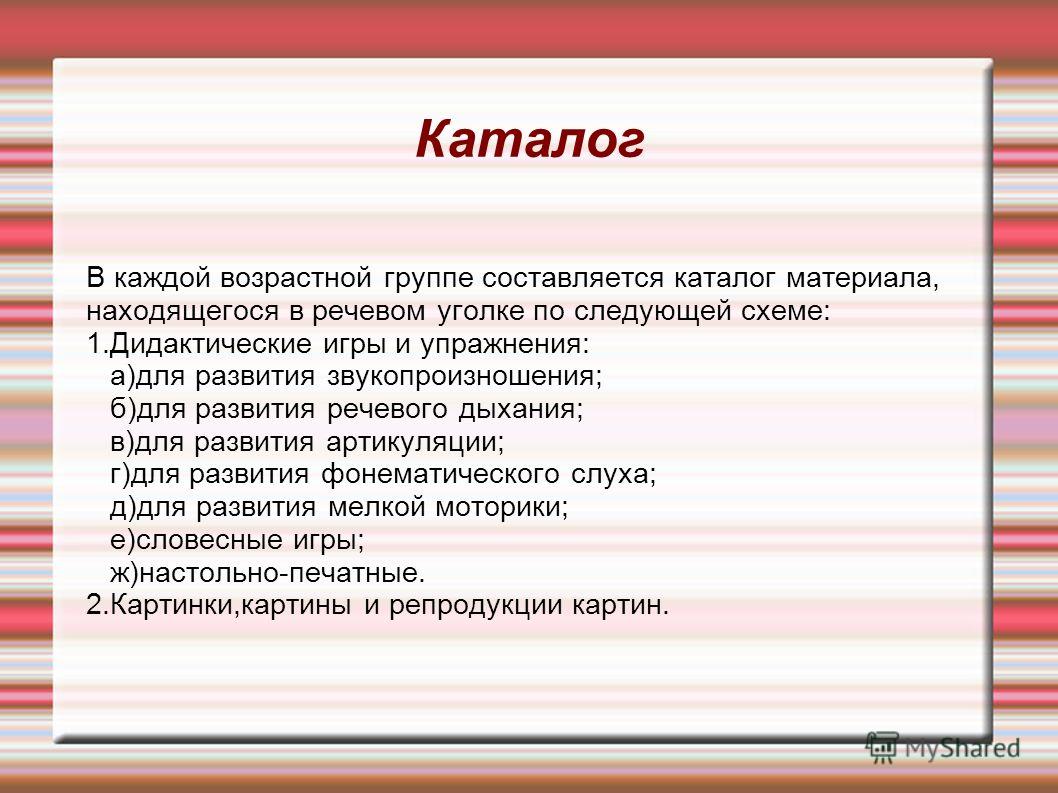 Каталог В каждой возрастной группе составляется каталог материала, находящегося в речевом уголке по следующей схеме: 1.Дидактические игры и упражнения: а)для развития звукопроизношения; б)для развития речевого дыхания; в)для развития артикуляции; г)для развития фонематического слуха; д)для развития мелкой моторики; е)словесные игры; ж)настольно-печатные. 2.Картинки,картины и репродукции картин.