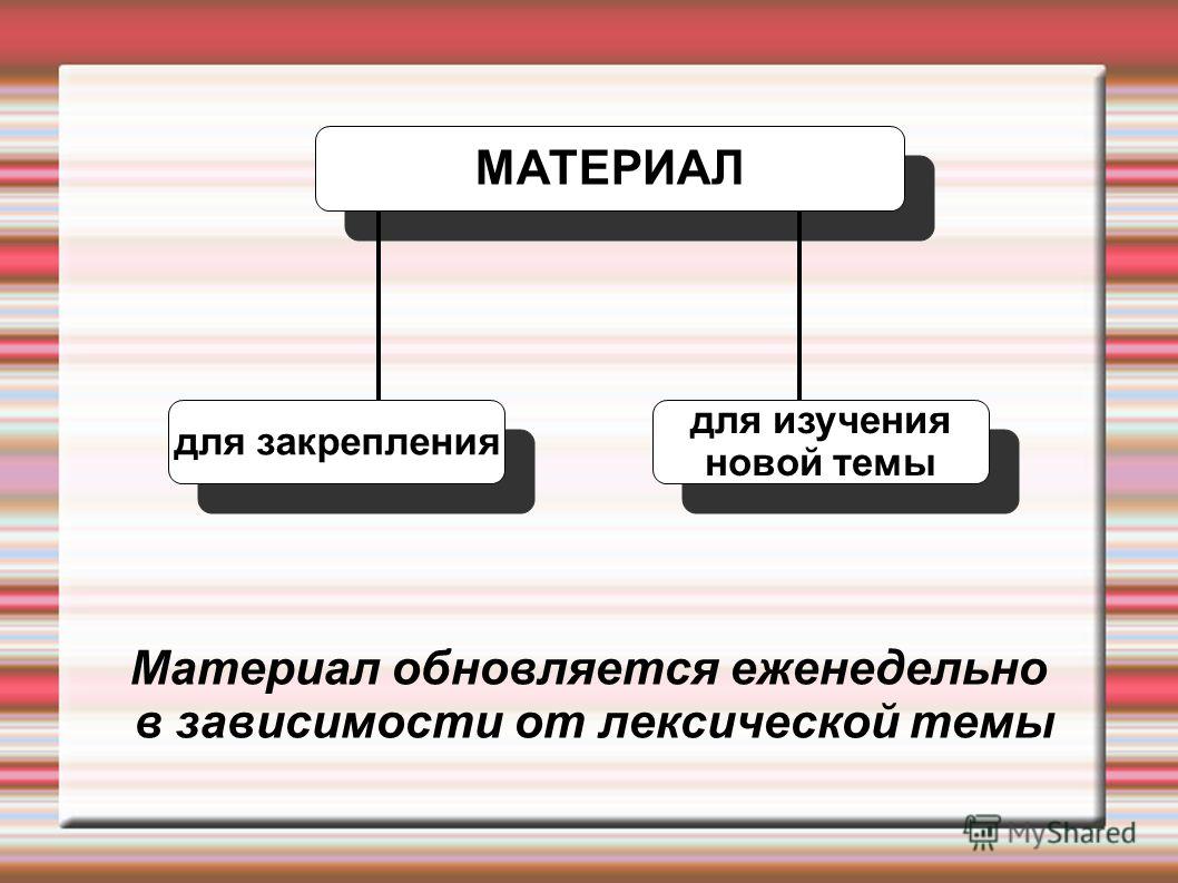 для закрепления для изучения новой темы для изучения новой темы МАТЕРИАЛ Материал обновляется еженедельно в зависимости от лексической темы