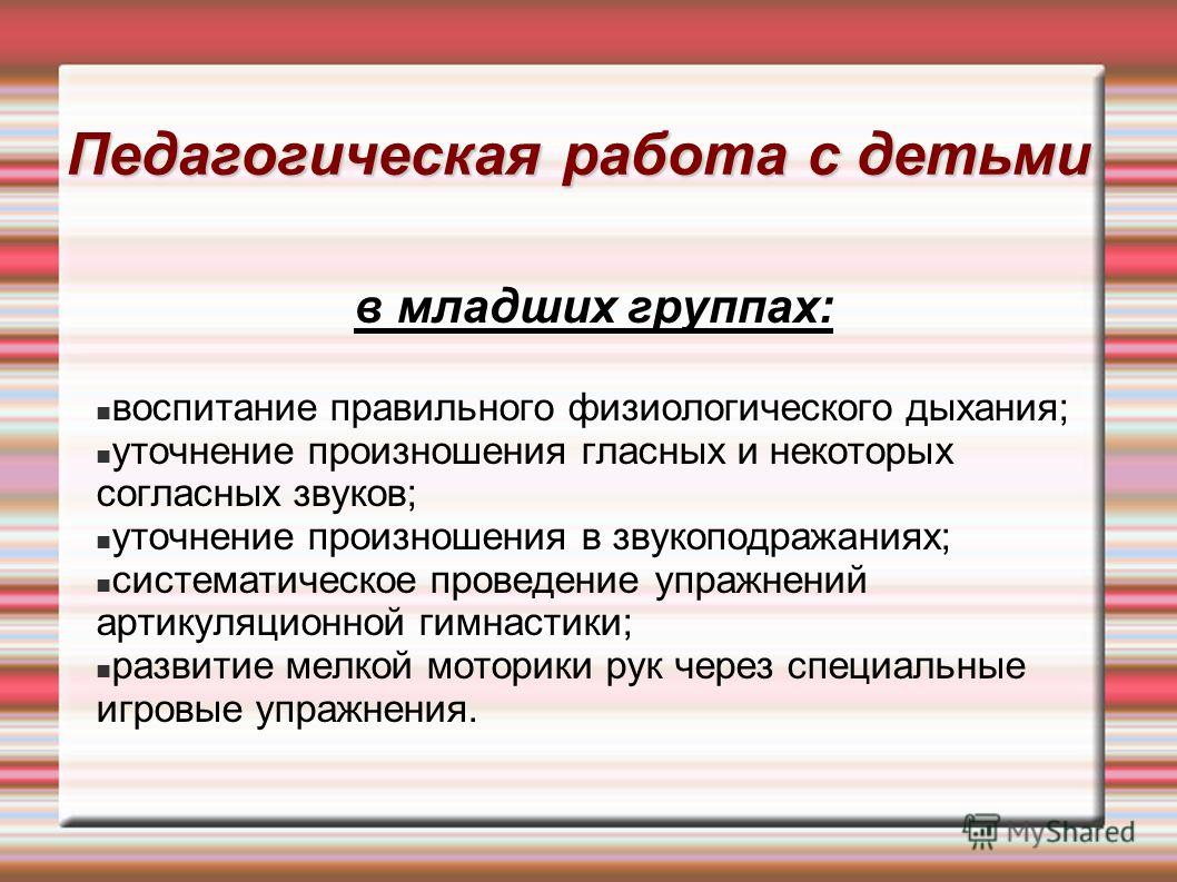 Педагогическая работа с детьми в младших группах: воспитание правильного физиологического дыхания; уточнение произношения гласных и некоторых согласных звуков; уточнение произношения в звукоподражаниях; систематическое проведение упражнений артикуляционной гимнастики; развитие мелкой моторики рук через специальные игровые упражнения.