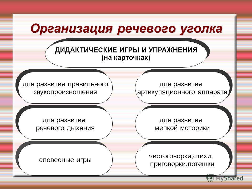 Организация речевого уголка ДИДАКТИЧЕСКИЕ ИГРЫ И УПРАЖНЕНИЯ (на карточках) ДИДАКТИЧЕСКИЕ ИГРЫ И УПРАЖНЕНИЯ (на карточках) для развития правильного звукопроизношения для развития правильного звукопроизношения для развития артикуляционного аппарата для развития артикуляционного аппарата для развития речевого дыхания для развития речевого дыхания для развития мелкой моторики для развития мелкой моторики словесные игры чистоговорки,стихи, приговорки,потешки чистоговорки,стихи, приговорки,потешки